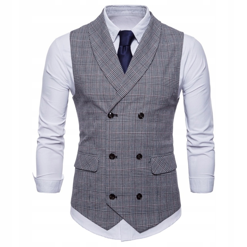Męska, elegancka kamizelka dwurzędowa zapinana na guziki.