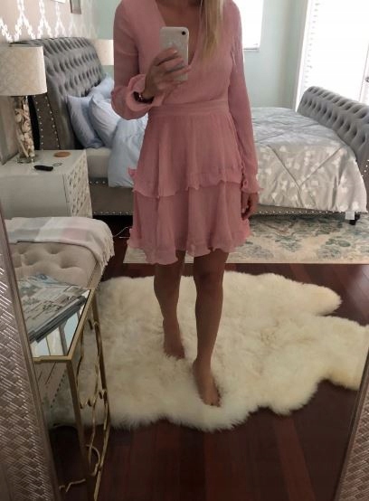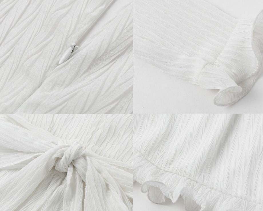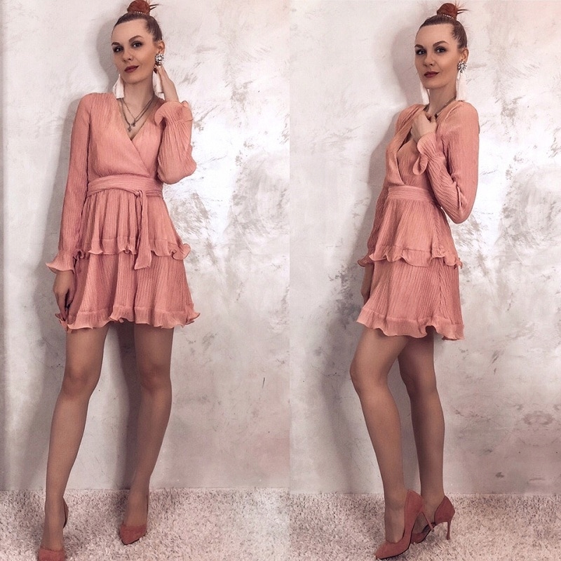 Sukienka posiada kopertowy dekolt, wiązanie w pasie oraz urocze falbanki w talii, u dołu oraz na końcu rękawów.
